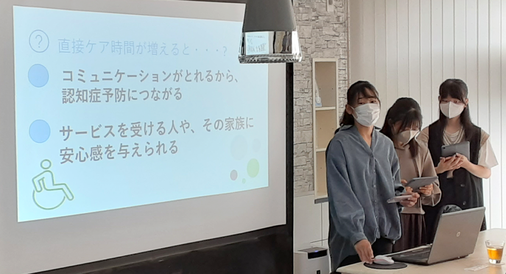 キャリア探究学習は、他者とコミュニケーションをとりながら主体的に物事を考え、自分の意見を発表するという趣旨で行われました。3人の生徒は課題に向かって協力しながらプレゼンテーション資料を作成し、コンピュータやAIとは違い時に間違え時に悩む人間ならではの価値などについて、株式会社エムリンクホールディングスの本見研介代表取締役、株式会社エムリンク札幌の本見翔代表取締役らの前で発表しました。